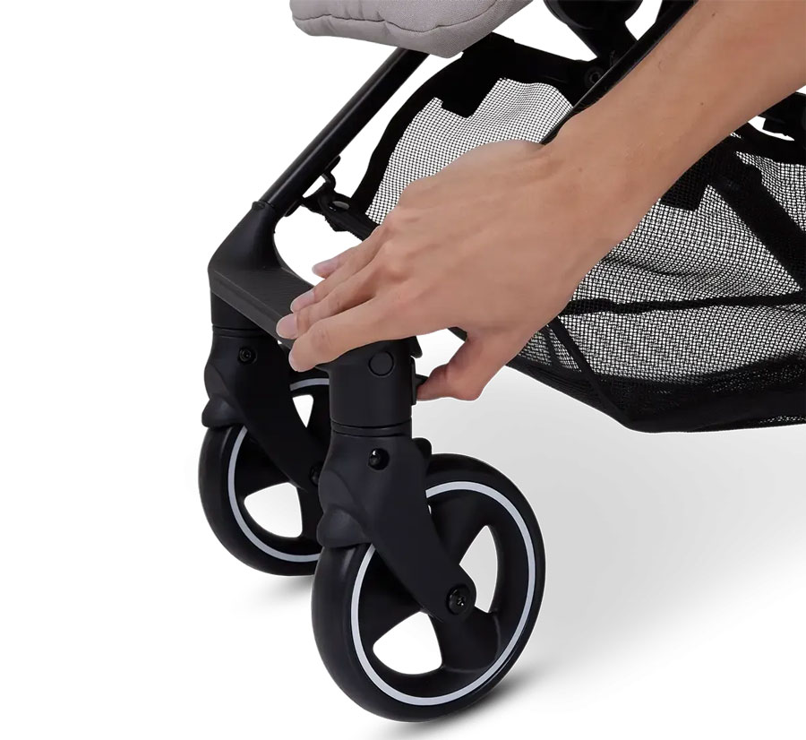 Το ποδόφρενο, βρίσκεται ακριβώς στον πίσω δεξιό τροχό, εξαλείφοντας την ανάγκη για πίσω άξονα. Αυτό όχι μόνο μειώνει το βάρος και εξοικονομεί χώρο, αλλά παρέχει επίσης περισσότερη άνεση κατά το σπρώξιμο, ειδικά για τους ψηλότερους γονείς, χάρη στον επιπλέον χώρο για τα πόδια.
