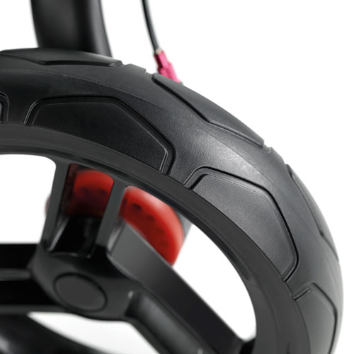Μεγάλοι τροχοί για όλα τα εδάφη, με ελαστικά PU. Οι μπροστινοί τροχοί περιστρέφονται 360° με δυνατότητα κλειδώματος της περιστροφής, ανάλογα με το έδαφος.
