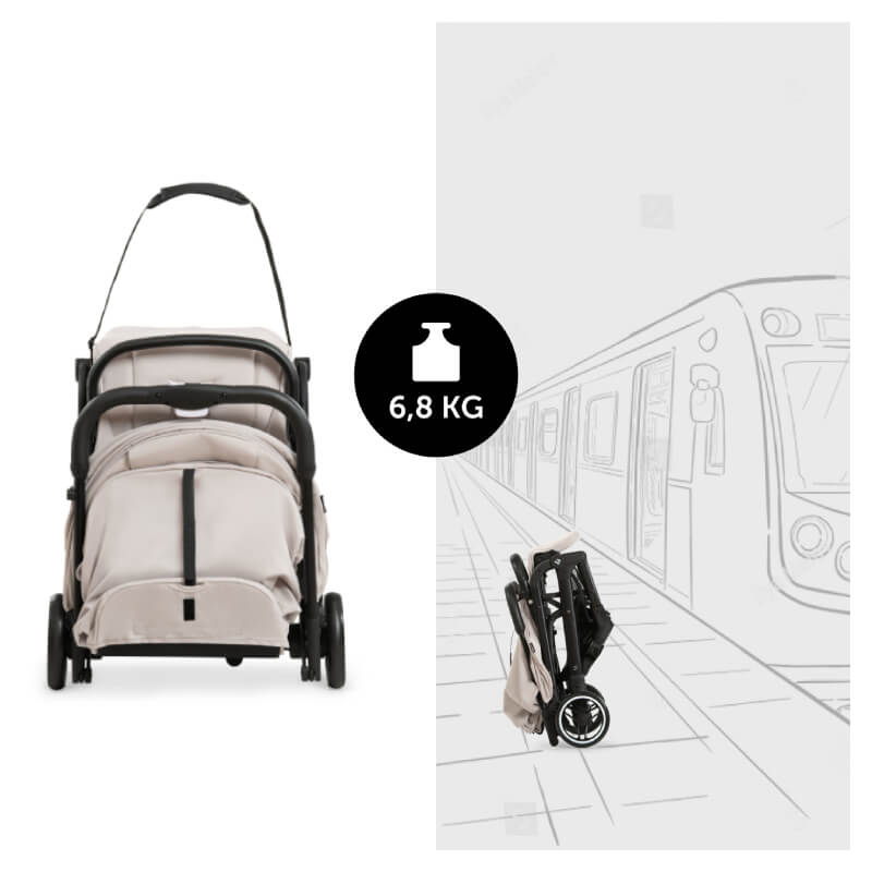 Όταν ταξιδεύετε με λεωφορείο, τρένο ή αεροπλάνο, μπορείτε να διπλώσετε γρήγορα το καρότσι με το ένα χέρι. Εάν το παιδί προτιμά να περπατάει, μπορείτε να το μεταφέρετε άνετα στον ώμο σας με τον ιμάντα ώμου με επένδυση.