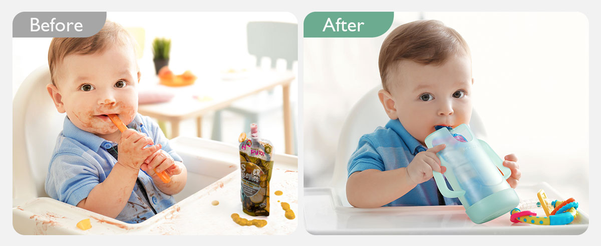 Αυτή η θήκη εμποδίζει τη συμπίεση της συσκευασίας και μειώνει τον κίνδυνο χυσίματος ή διαρροής πουρέδων και χυμών. Κατάλληλη για χρήση στον καναπέ, στο κάθισμα αυτοκινήτου ή σε καρεκλάκι φαγητού.