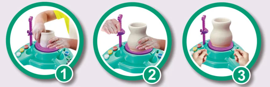 Τοποθετήστε τον πηλό στον τροχό και επιλέξτε ταχύτητα από τον διακόπτη στο πλάι. Ξεκινήστε να διαμορφώνεται με τα χέρια σας και μετά πλάθετε με μεγαλύτερη ακρίβεια, με τα εργαλεία που περιλαμβάνονται. Μπορείτε να χρησιμοποιήσετε το μπράτσο στη πλαϊνή μεριά για να σας βοηθήσει να ανεβείτε επίπεδο. Όταν το κομμάτι είναι έτοιμο, χρησιμοποιήστε το νήμα και το εργαλείο λαβής, για να κόψετε το κάτω μέρος και να αφαιρέσετε το κομμάτι σας από τον τροχό του αγγειοπλάστη. Αφήστε τον να στεγνώσει. Στη συνέχεια διακοσμήστε σύμφωνα με τις προτιμήσεις σας!.