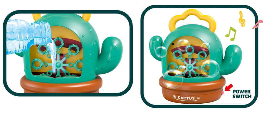 Ρίξτε υγρό σαπουνιού στο μπροστινό μέρος του κάκτου και, στη συνέχεια, πατήστε το κουμπί. Ετοιμος! Το παιχνίδι σας θα αρχίσει να δημιουργεί πολλές φυσαλίδες για μεγάλη διασκέδαση.