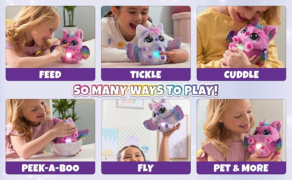 • 100+ ήχοι και αντιδράσεις: Μιλήστε, γαργαλήστε, τροφοδοτήστε και χορέψτε με το Hatchimal σας. Μπορεί ακόμη και να κινεί τα φτερά του και να παίζει παιχνίδια όπως το "Peek-a-Boo".