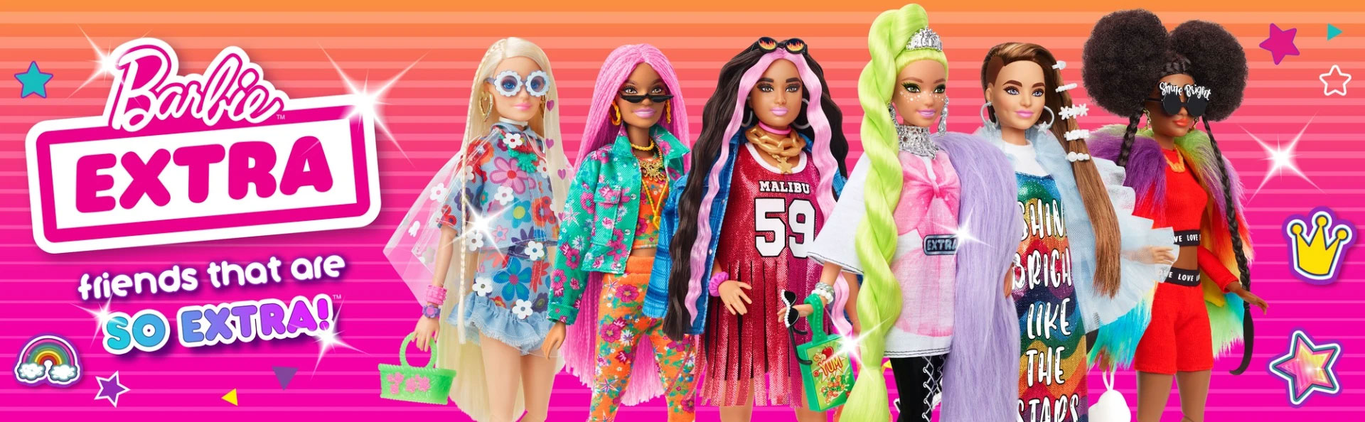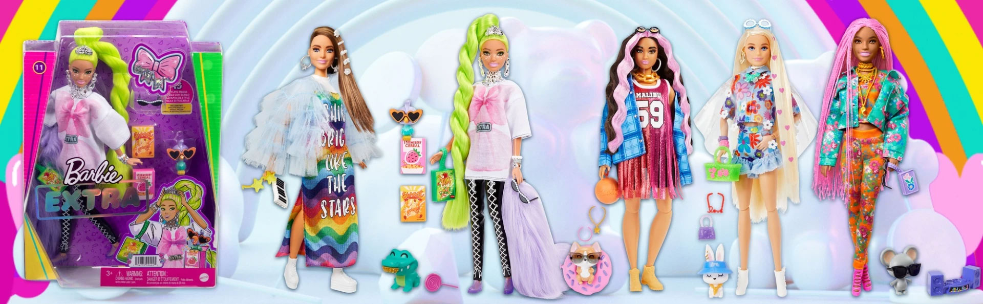 Σκοπός τους είναι να διασκεδάσουν με τη μόδα με glitter, gummy bears, emoticons και φουσκωτά μαλλιά – φέρνοντας EXTRA vibes όπου κι αν πάνε. Όσον αφορά τη μόδα, οι κούκλες Barbie® Extra έχουν μια στάση το περισσότερο-είναι-περισσότερο, με 15 τεμάχια που περιλαμβάνουν ρούχα και αξεσουάρ μόδας, καθώς και αξεσουάρ για κατοικίδια και ζωάκια.