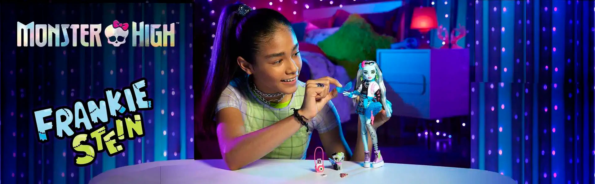 Το σχολείο ξεκινά ξανά και τα φαντάσματα Monster High εμφανίζονται με ύφος κραυγής!. Η κούκλα Frankie Stein περπατά στις αίθουσες του Monster High με μια απίστευτα ηλεκτρισμένη στολή, με καρό φούστα, μπλούζα με αστραπή και ένα γιλέκο με λεπτομέρειες από βελονιά. Η μοναδικά φοβερή εμφάνισή της, συμπληρώνεται από αθλητικά παπούτσια πλατφόρμας, ανατριχιαστικά αξεσουάρ και ένα λεπτομερές προσθετικό πόδι.