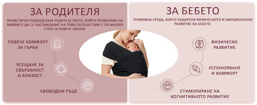 Άνετο και φιλικό προς το δέρμα υλικό: Κατασκευασμένο από 95% πολυεστέρα και 5% ελαστάνη, το sling είναι απαλό, αναπνεύσιμο και απαλό με το δέρμα του μωρού. Εφαρμόζει άνετα στο σώμα, επιτρέποντας στο παιδί να νιώσει την εγγύτητα και τη ζεστασιά της μαμάς ή του μπαμπά - σαν να είναι σε αγκαλιά. Αυτό δημιουργεί ένα αίσθημα ασφάλειας και βοηθά στην οικοδόμηση ενός ισχυρού δεσμού μεταξύ γονέα και παιδιού.