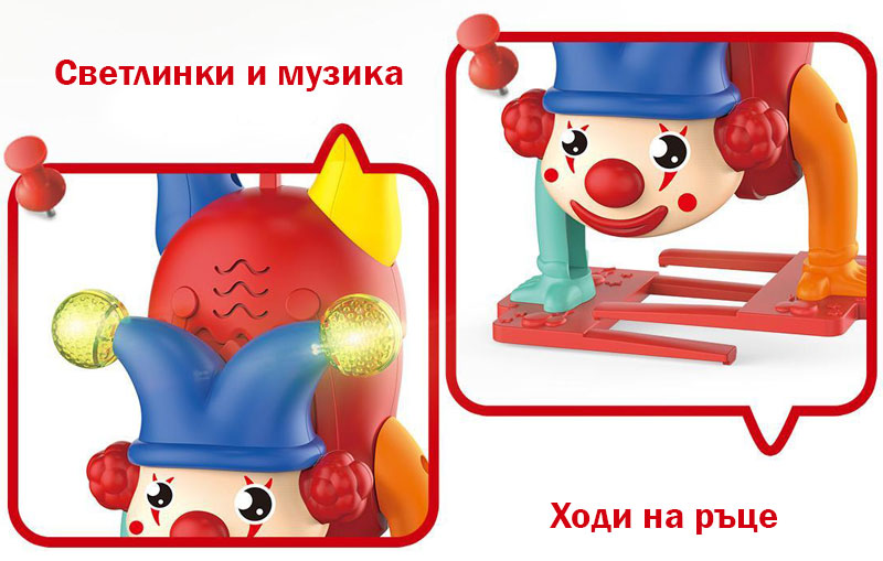 Ο διασκεδαστικός μουσικός Κλόουν, μπορεί να περπατήσει στα χέρια του!. Καθώς κινείται, το παιχνίδι συνοδεύεται από χαρούμενα μουσικά εφέ και τα ποδαράκια και το καπέλο του ανάβουν.