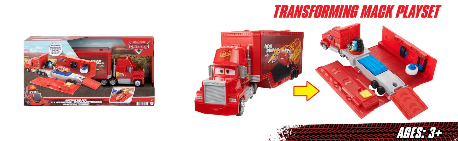 Με το Disney και Pixar Cars Transforming Mack Playset, τα παιδιά μπορούν να τραβήξουν, να συντονίσουν και πολλά άλλα! Αυτό το φορτηγό κάνει διπλή λειτουργία ως όχημα ώθησης και αναδιπλούμενο σετ παιχνιδιού αναπαραγωγής αγώνων αυτοκινήτου Cars Race Cars (πωλείται χωριστά).