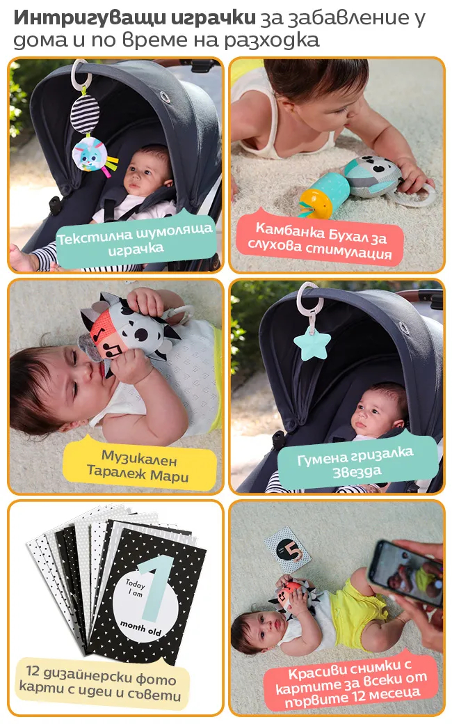 Το σετ περιλαμβάνει 4 αισθητηριακά παιχνίδια με δακτυλίους Clip & Go για εύκολη σύνδεση σε καρότσι μωρού ή κρεβατάκι, και 12 κάρτες με αναπτυξιακά ορόσημα κατά τον πρώτο χρόνο.
