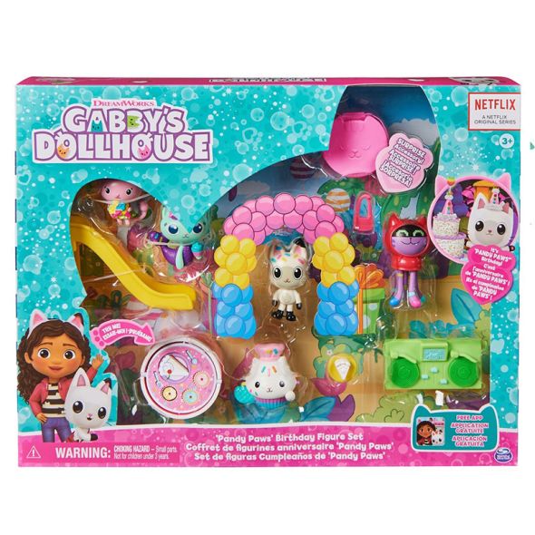 Το σετ περιλαμβάνει μια σειρά στοιχείων για να δημιουργήσετε το πάρτι των ονείρων σας - ένα όμορφο θεματικό σκηνικό, καμάρα με μπαλόνι (χαρτόνι), τσουλήθρα, τραπέζι DJ, κομμάτι τούρτας, πιάτο και τραπέζι που περιστρέφεται για να αποκαλύψει λιχουδιές γενεθλίων και δώρα. Στο σετ θα βρείτε και ένα κουτί παράδοσης που κρύβει την τελευταία έκπληξη. Για να το αποκτήσετε, σαρώστε τον κωδικό QR μέσα για να ξεκλειδώσετε μια ειδική ανταμοιβή στη δωρεάν εφαρμογή Gabby's Dollhouse (διαθέσιμη για iOS και Android).