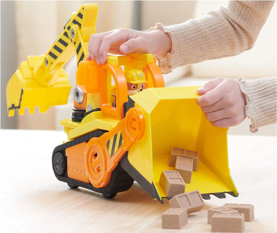 Το παιχνίδι μπουλντόζας του Rubble έχει κινούμενα μέρη, ώστε τα παιδιά να μπορούν να σκάβουν, να σαρώνουν και να φορτώνουν καθώς δημιουργούν περιπέτειες κατασκευών.