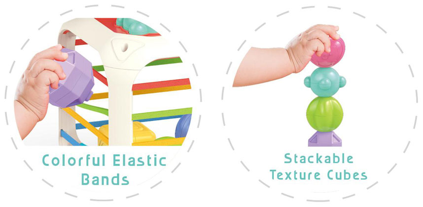 Οι πλευρές του κύβου, έχουν χρωματιστές ελαστικές ταινίες, μέσω των οποίων το μωρό μπορεί να βγάλει τα σχήματα που είναι τοποθετημένα μέσα.