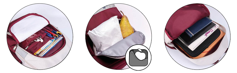 Ένα μεγάλο και άνετο σχολικό σακίδιο με πολλές πρακτικές τσέπες αποθήκευσης, συμπεριλαμβανομένης μιας ειδικής μονωμένης τσέπης για μεσημεριανό γεύμα: