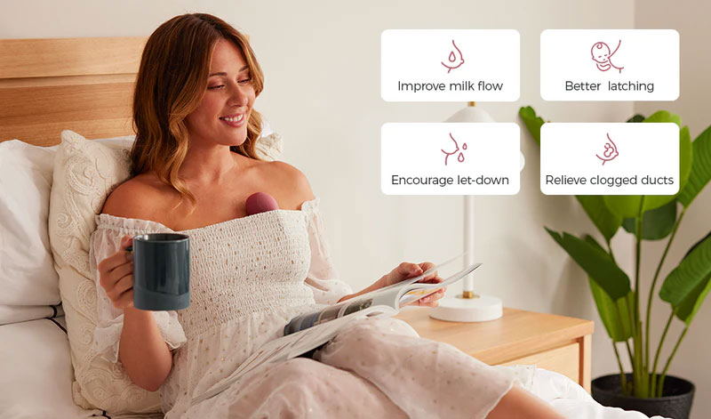 Οι δόνηση και το στρογγυλεμένο σχήμα, βοηθούν στο να αποφράσσονται γρήγορα οι αγωγοί και η θέρμανση διεγείρει τη ροή του γάλακτος και μαλακώνει το στήθος. Οι φαρδιές πλευρές του μασάζ, βοηθούν στη μετακίνηση των υγρών και διευκολύνουν την εξαγωγή μητρικού γάλακτος.