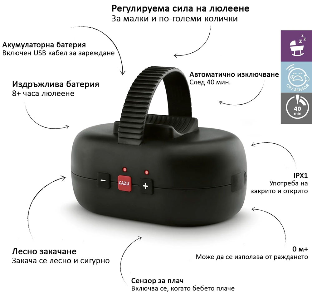 Το ZAZU Robby προσαρμόζεται επίσης σε βρεφικά καθίσματα αυτοκινήτου, στερεώνοντας το με ασφάλεια στη λαβή με τον ενσωματωμένο ιμάντα. Αυτή η ευελιξία, επιτρέπει στο μωρό να απολαμβάνει την χαλαρωτική αιώρηση ακόμα και κατά τη διάρκεια ενός ταξιδιού με το αυτοκίνητο.