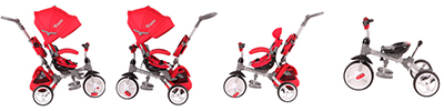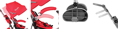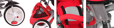 | Χαρακτηριστικά τρίκυκλων | Με υποπόδιο για τα ποδαράκια, Μετατρέπεται σε, Περιστρεφόμενο κάθισμα, Ρύθμιση πλάτης, Με γονικό έλεγχο, Με κλειδαριά πεντάλ, Με σκίαστρο, Με σανίδα προστασίας , Με ζώνη προστασίας, Με αποθηκευτικό χώρο, Με ταπετσαρία |