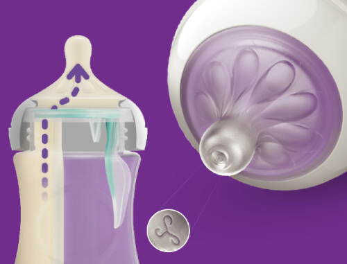 Η βαλβίδα κατά των κολικών Natural Response που είναι ενσωματωμένη στην πιπίλα μαζί με την βαλβίδα AirFree, εμποδίζουν τον αέρα να εισέλθει στην κοιλιά του μωρού, κατά τη διάρκεια του σίτισης, συμβάλλοντας στη μείωση των κολικών και της δυσφορίας.