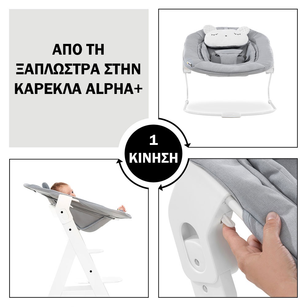Το Alpha Bouncer μπορεί να χρησιμοποιηθεί είτε ως κλασική ξαπλώστρα είτε ως μονάδα νεογέννητου στο ξύλινο καρεκλάκι φαγητού Alpha+ (πωλείται χωριστά), επιτρέποντας στο μωρό σας να βρίσκεται στο ύψος των ματιών σας από τη γέννηση καθώς και να κάθεται στο τραπέζι με όλη την οικογένεια. Η τοποθέτηση στο κάθισμα είναι εύκολη και γρήγορη με ένα κλικ.